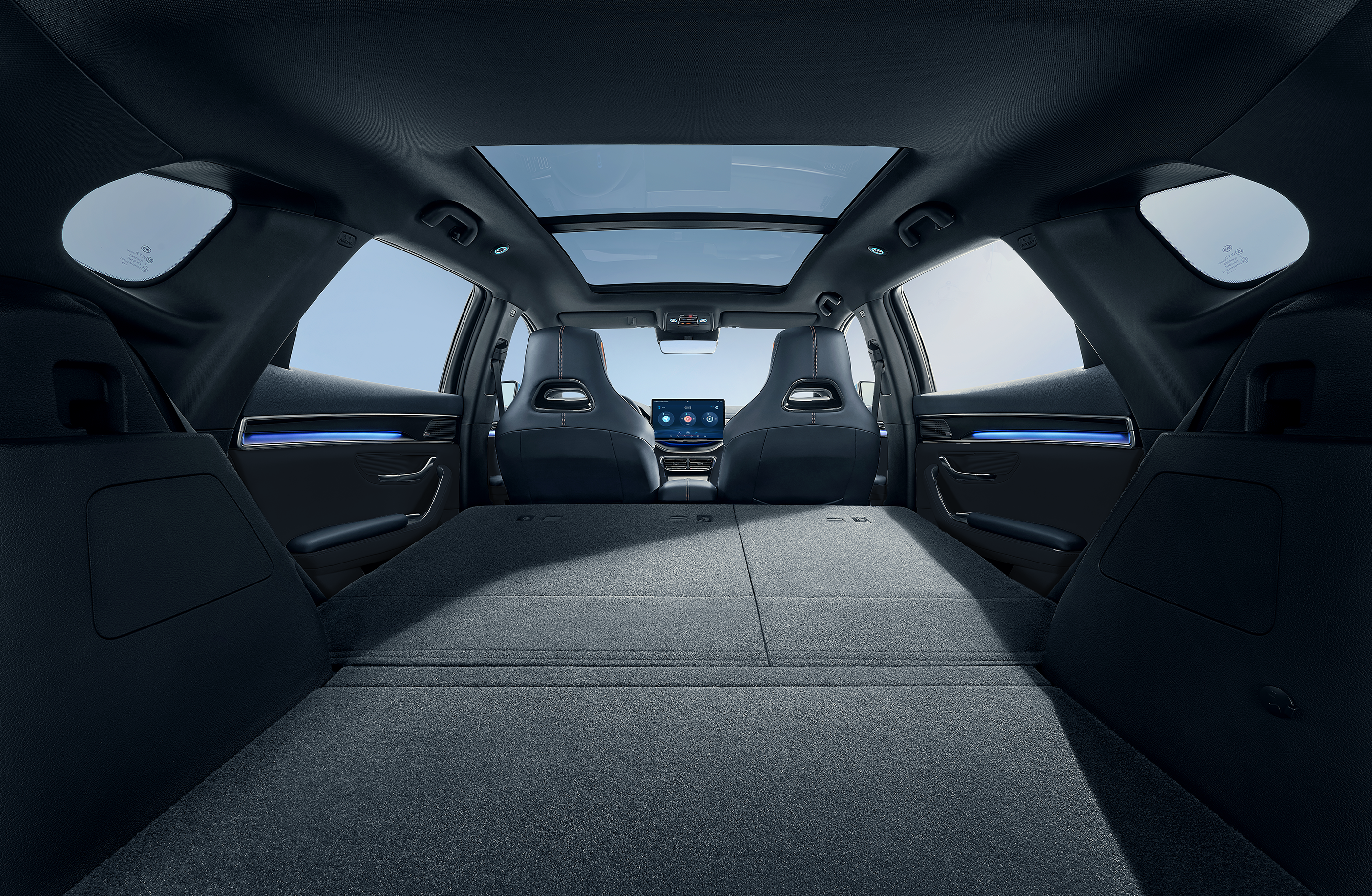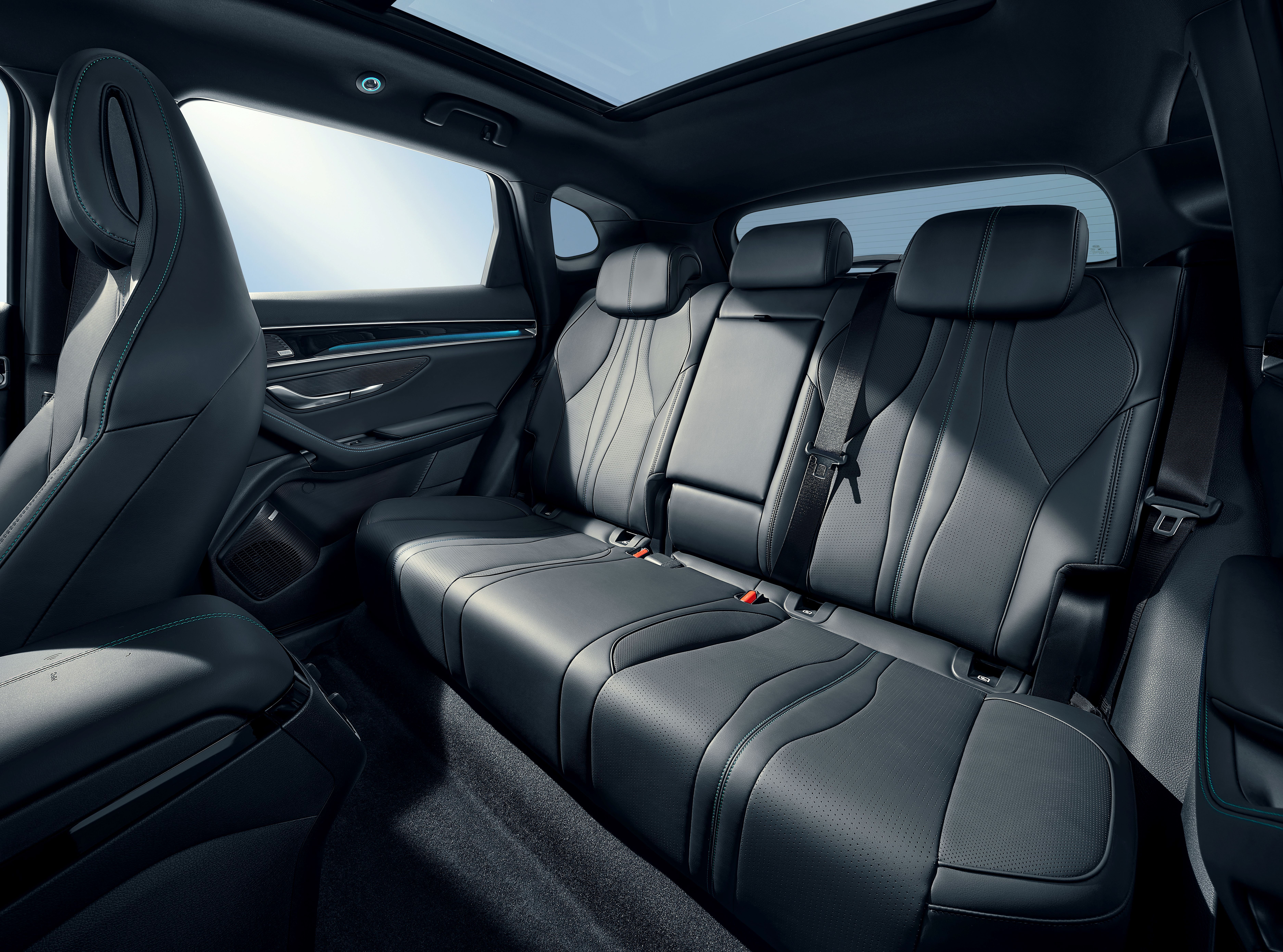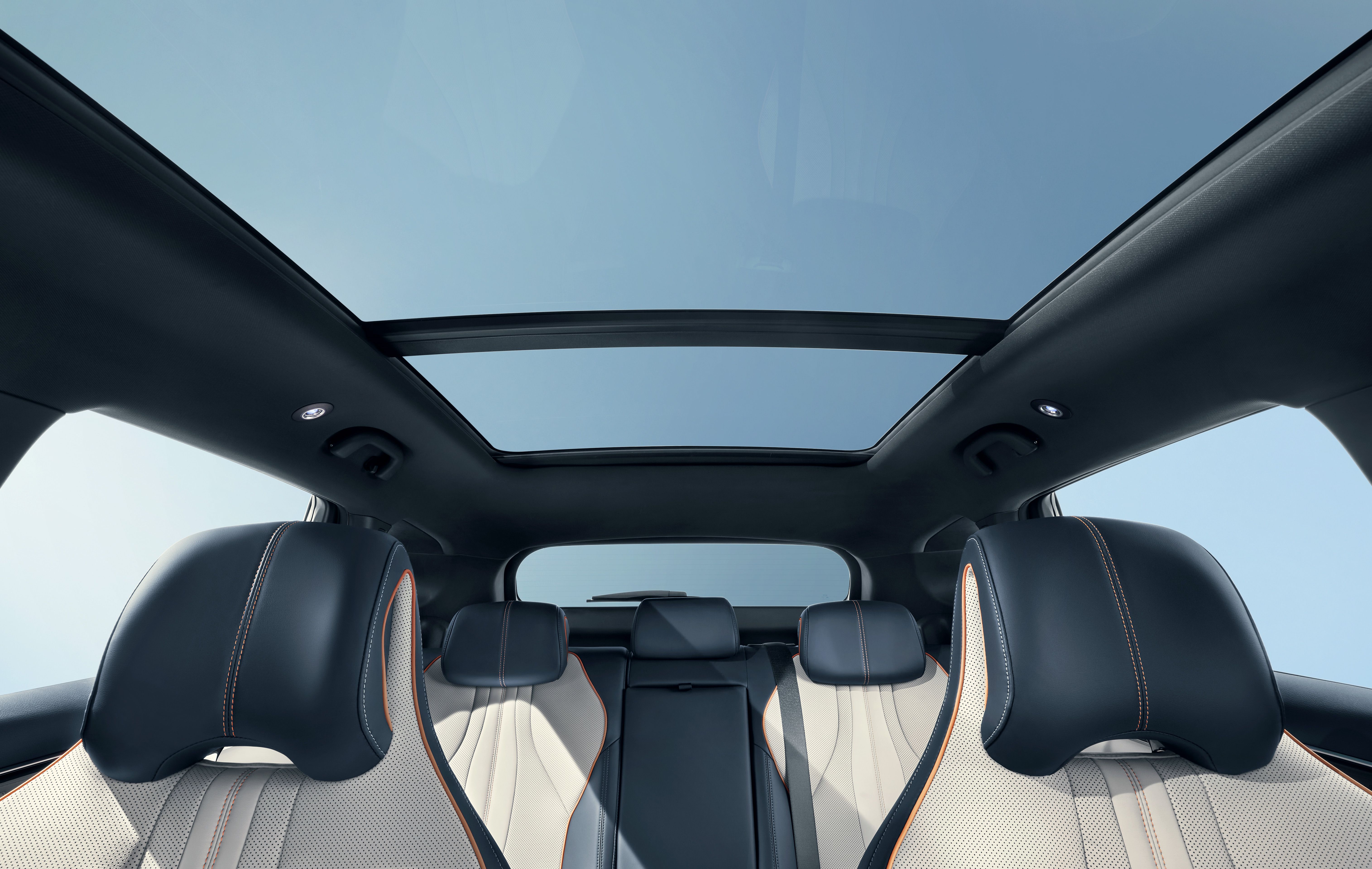 Et stort panorama soltak strekker seg over hele taket, og bidrar til en lys og luftig kupe.