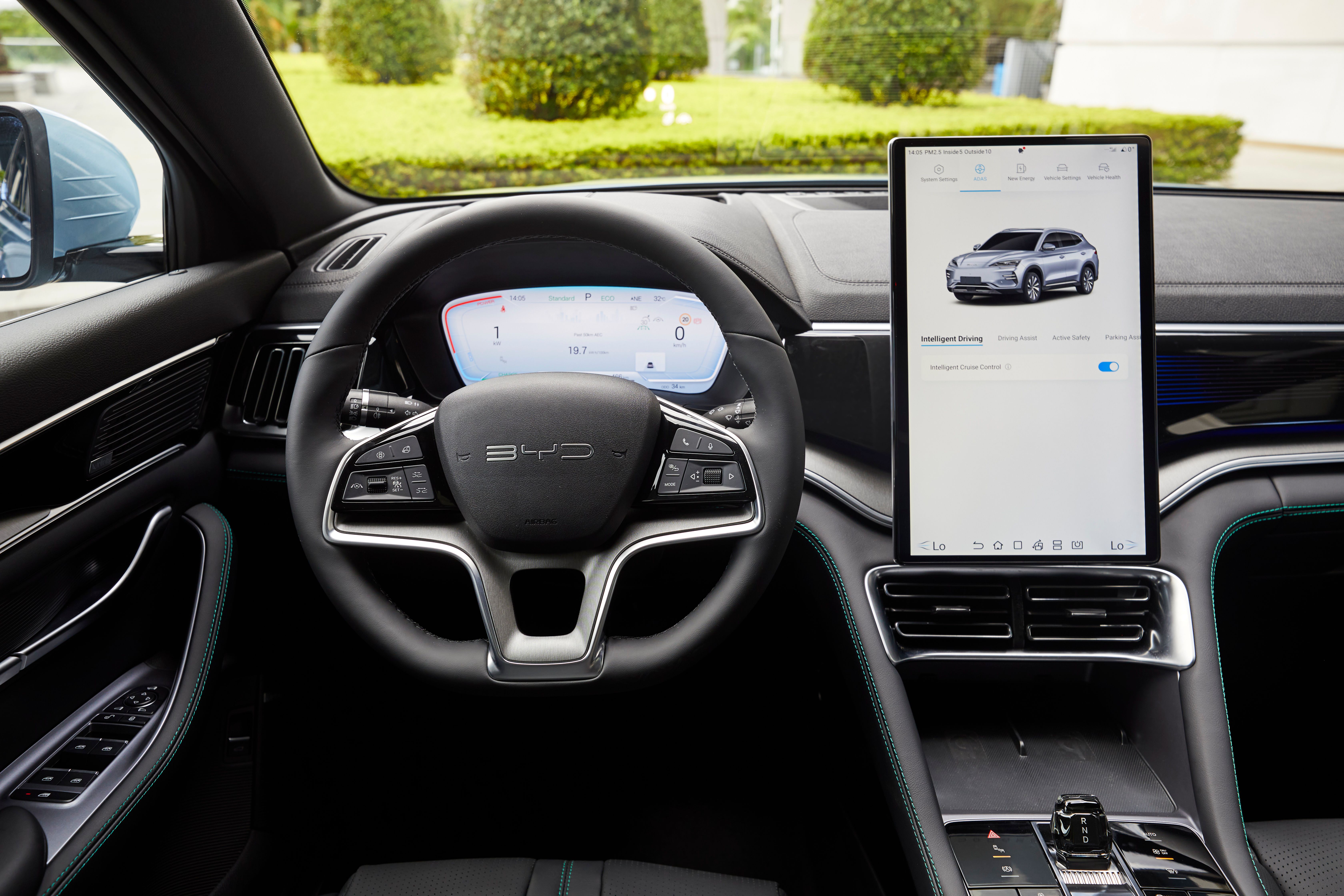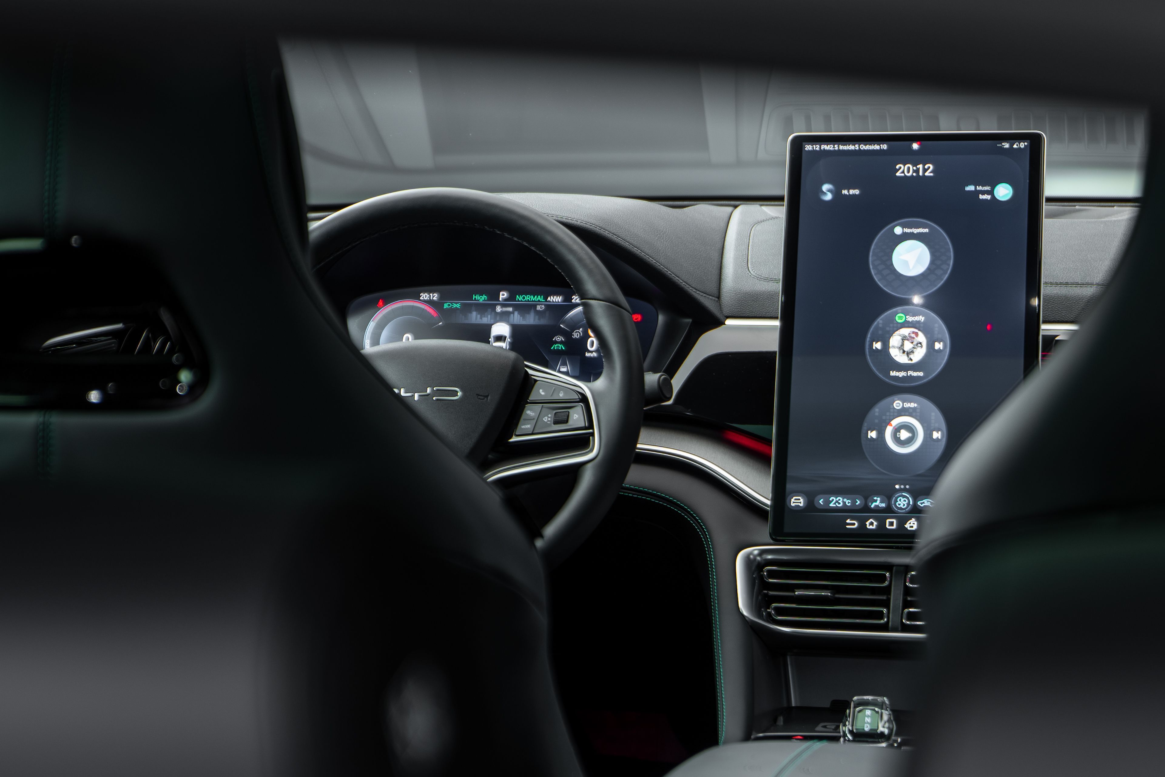 BYD Seal U er utstyrt med en 15,6" roterbar touchskjerm. Her kan man styre alle bilens kontrollfunksjoner, og inneholder 4G-tilkobling, Spotify, Andoroid Auto og Apple Carplay.